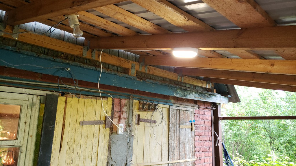 Ну а заодно можно обновить и освещение на веранде с древней переноски с лампой накаливания в керамическом патроне, на более энергоэффективный LED-же светильник: